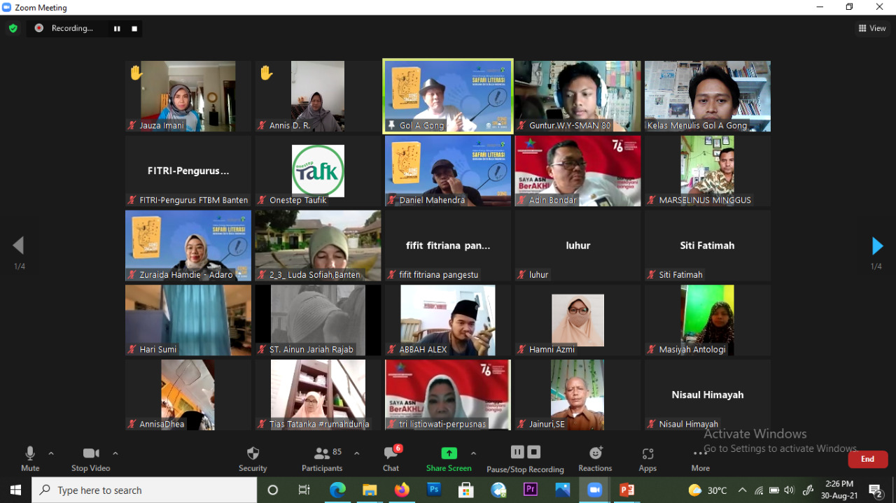 KURUNGBUKA.com, SERANG – Adaro Energy mengadakan acara Safari Literasi bersama Duta Baca Indonesia, Gol A Gong melalui diskusi virtual, Senin (20/08/2021). Mas Gong, Sapaan akrabnya, menjelaskan kegiatan ini merupakan sebuah rangkaian Lokakarya Penulisan dari Fakta ke Tulisan dan dari Tulisan ke Buku, serta Gerakan Indonesia Menulis.