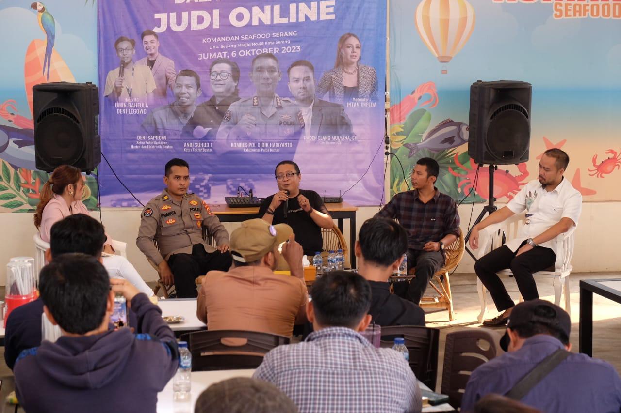 Diskusi terbuka yang di gelar dengan para narasumber IPTU Yudha Pranata, SH dari Perwakilan Polda Banten, Andi Suhud dari Fekraf Banten, Deni Saprowi dari POKJA Wartawan Harian dan Elektronik Banten serta Raden Elang Mulyana, SH sebagai Kuasa Hukum ICN, membahas banyaknya content creator dan Influencer yang terjerat kasus hukum akibat ketidak pahaman tentang larangan mempromosikan judi online.