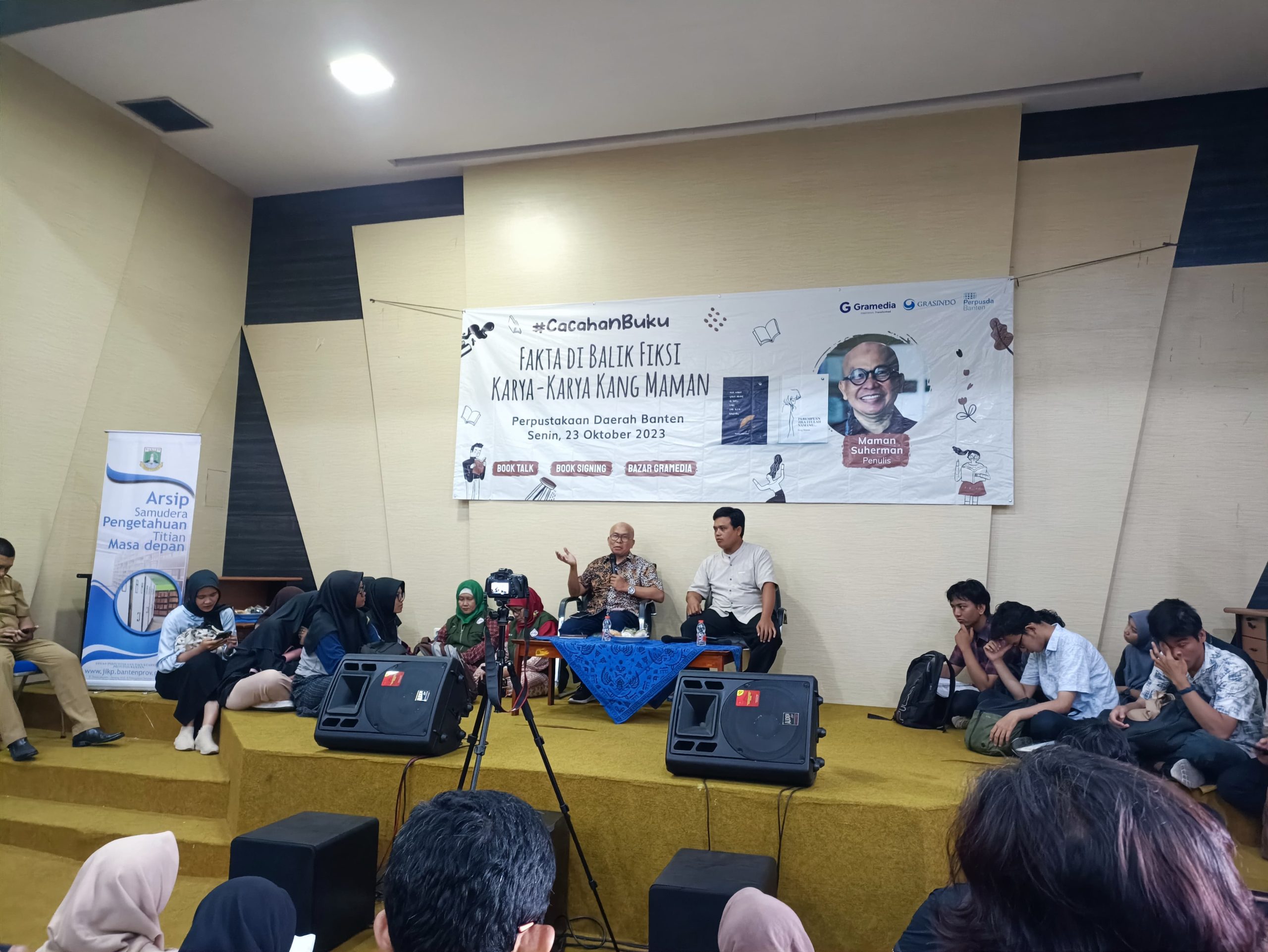 KURUNGBUKA.com, SERANG – Memeriahkan bulan bahasa, Perpustakaan dan Kearsipan (DPK) Provinsi Banten bekerja sama dengan Gramedia Cilegon dan Sastra Grasindo menyelenggarakan #CacahanBuku “Fakta Di Balik Fiksi Karya-karya Kang Maman” bersama Maman Suherman pada Senin (23/10/2023) pukul 14.00 WIB di Gedung Arsip lantai 4 DPK Provinsi Banten.