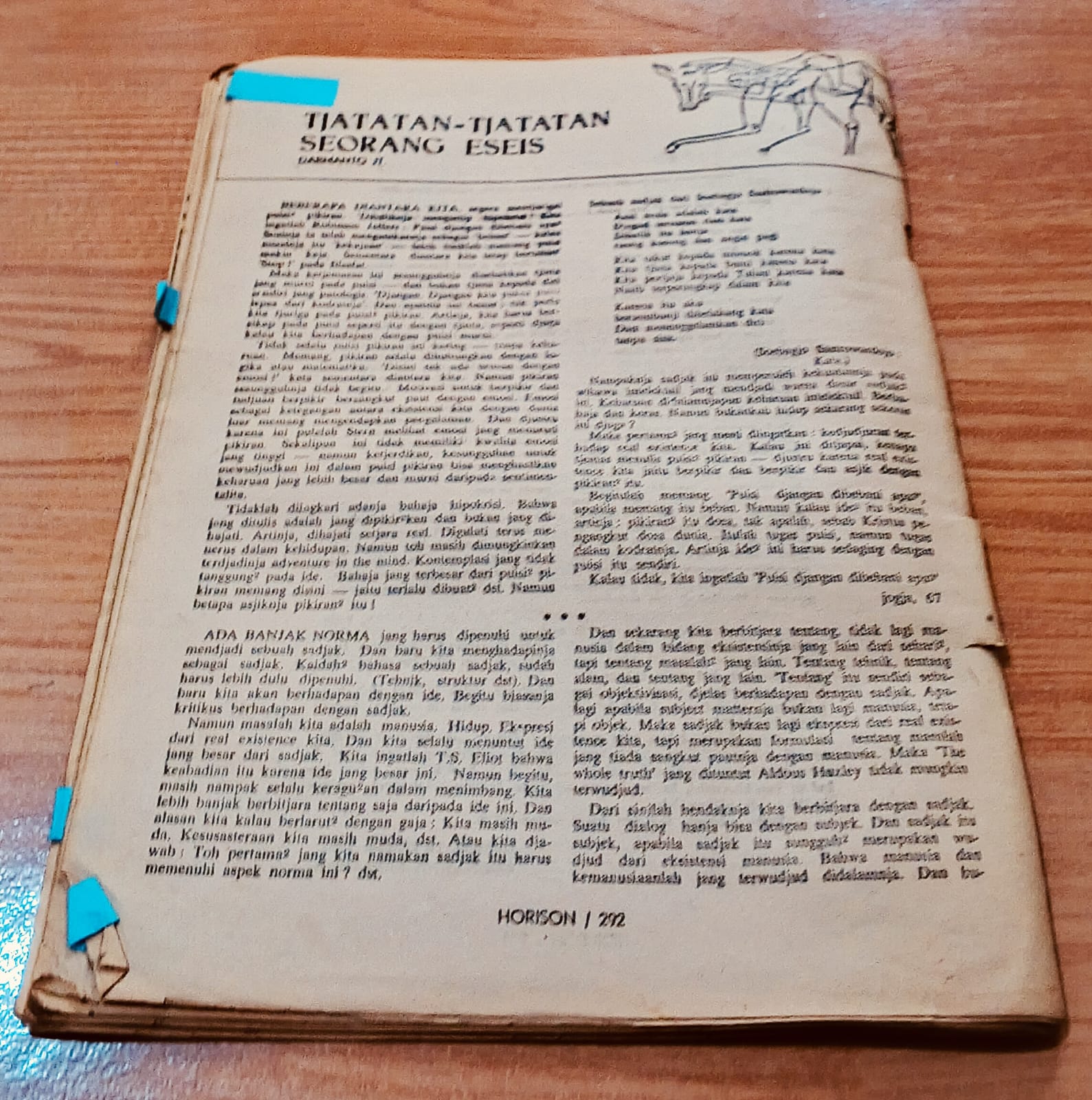 Apakah ia menulis menggunakan bolpoin di kertas bergaris? Apakah ia langsung memainkan mesin tik? Bayangkan sosok yang terkenang muda, ganteng, berambut kribo sedang mengetik! Ia pasti tampak sebagai pengarang ampuh, yang memiliki cita rasa priyayi.