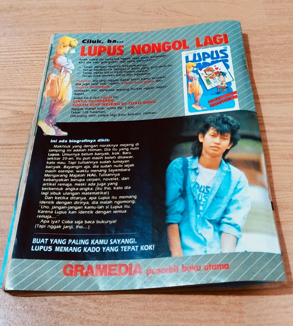 Di majalah Hai, 24 Februari 1987, kita terpesona iklan yang warna-warni. Mata membuktikan iklan tidak cuma hitam dan putih. Ada warna merah, biru, hijau, dan lain-lain. Yang diiklankan adalag seri buku Lupus yang berjudul Cinta Olimpiade. Janji yang disampaikan tentang Lupus: “Tetap dengan seabrek kekocakannya. Tetap berduet ria dengan si Boim yang amit-amit itu. Tetap bikin kami mesem-mesem. Tetap suka permen karet dan ngeledek.” Indonesia tanpa lupus maka para remaja mudah ngamuk dan sendu. Lupus yang menghibur, yang membuat Indonesia seru.