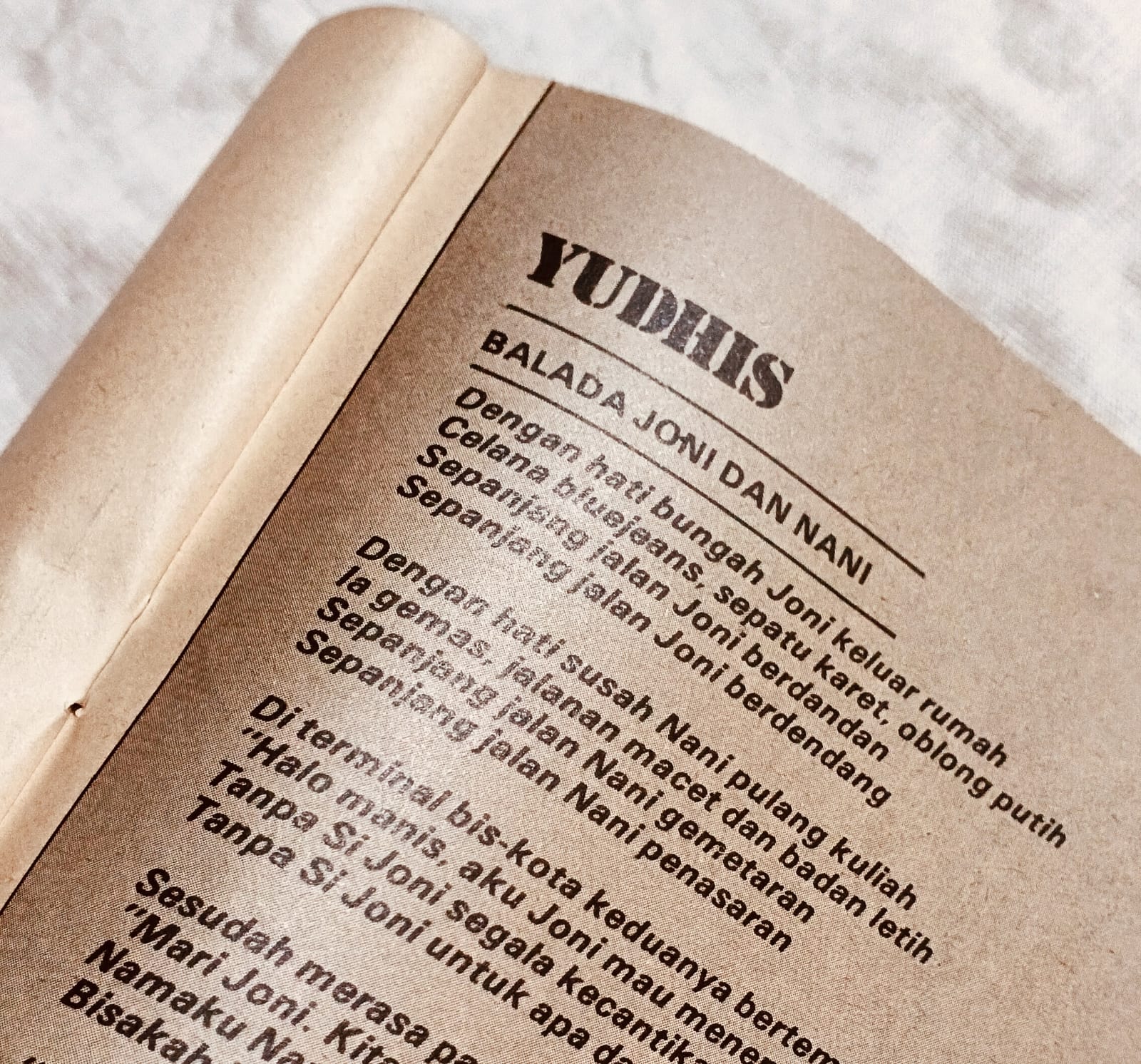Setelah rampung menyantap suguhan Rendra, para gadis berganti membaca puisi gubahan Yudhis yang berjudul “Balada Joni dan Nani”. Puisi yang agak lucu tapi boleh dicap puisi terlibat. Yang membaca menyadari nasib kaum muda masa 1980-an. Yudhis mengisahkan: Dengan hati bungah Joni keluar rumah/ Celana bluejeans, sepatu karet, oblong putih/ Sepanjang jalan Joni berdandan/ Sepanjang jalan Joni berdendang// Dengan hati susah Nani pulang kuliah/ Ia gemas jalanan macet dan badan letih/ Sepanjang jalan Nani gemetaran/ Sepanjang jalan Nani penasaran. Puisi yang “menghibur” dan mengajak menilai zaman.
