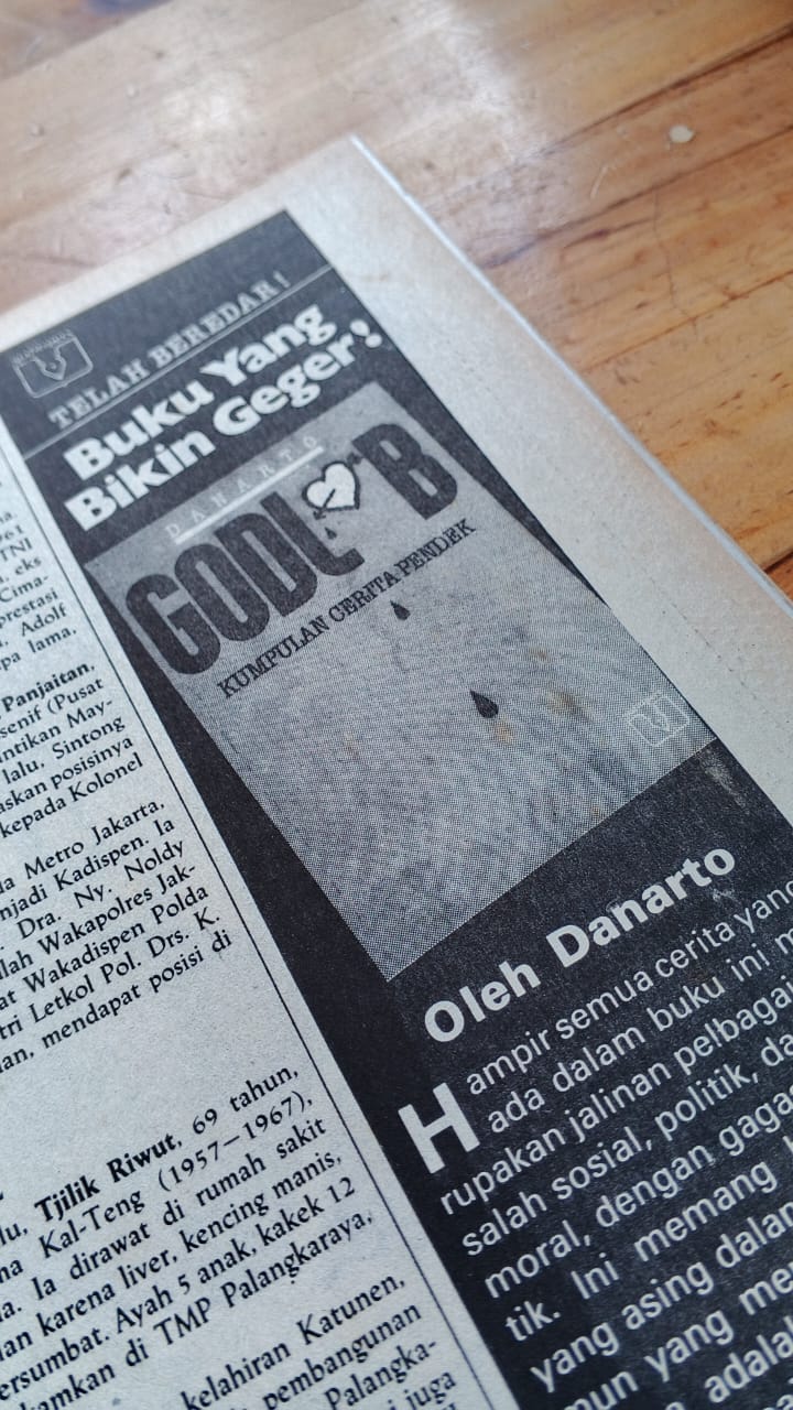 Yang ingin kita ingat bukan makam Danarto yang berada di Sragen tapi iklan. Cerita-cerita gubahan Danarto diterbitkan menjadi buku berjudul Godlob. Penulisannya kurang tepat. Yang melihat sampul buku bakal mengetahui ada tanda pengganti “o” di antara “l” dan “b”. Apakah kita salah baca? Yang bingung dengan cara penulisan Danarto jangan kebablasan membaca buku Umberto Eco yang diterjemahkan dalam bahasa Indonesia: Salah Baca.