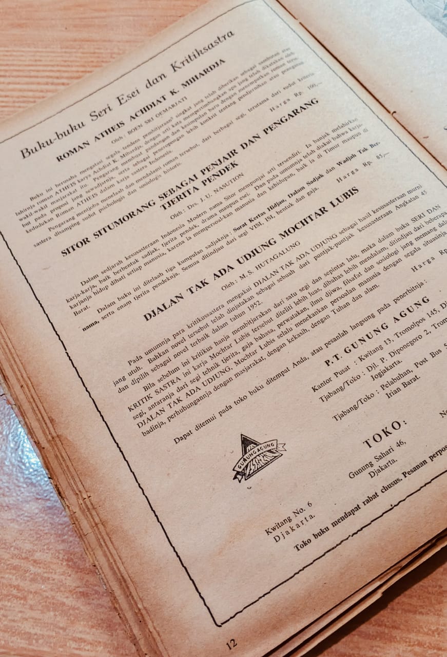 Di majalah Sastra, Nomor 11/12, Tahun II, 1963, kita melihat iklan buku dari Gunung Agung. Yang diiklankan bukan novel atau puisi tapi buku kelas berat. Tiga buku yang ditawarkan: Roman Atheis Achdiat K Mihardja (Boen S Oemarjati), Sitor Situmorang Sebagai Penjair dan Pengarang Tjerita Pendek (JU Nasution), dan Djalan Tak Ada Udjung Mochtar Lubis (MS Hutagalung). Umat sastra di Indonesia (sangat) mengenali Achdiat K Mihardja, Sitor Situmorang, dan Mochtar Lubis. Namun, tiga penulis yang membahas buku-buku mereka mungkin tidak dikenali, asing bagi penikmat sastra abad XXI.