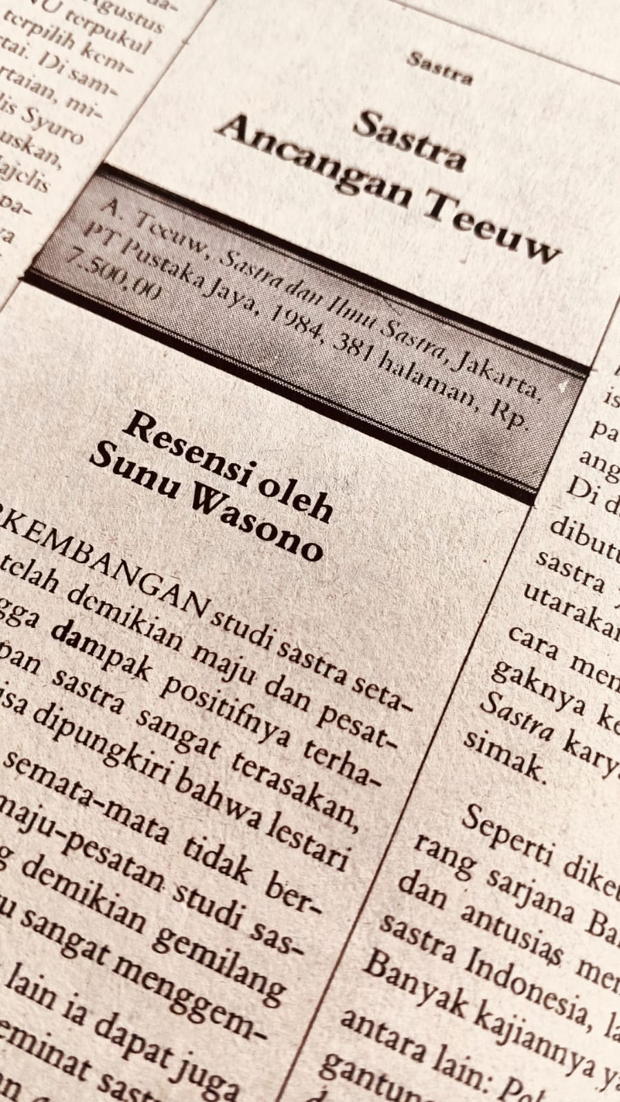 Buku yang terbit pada 1984 itu diresensi oleh Sunu Wasono dalam majalah Optimis edisi Januari 1985. Yang ditampilkan adalah foto penulis yang sudah tua dan berkacamata, bukan foto sampul buku. Resensi hanya pendek tapi makin memberi pengesahan bahwa A Teeu penting dan perlu dalam sastra Indonesia.