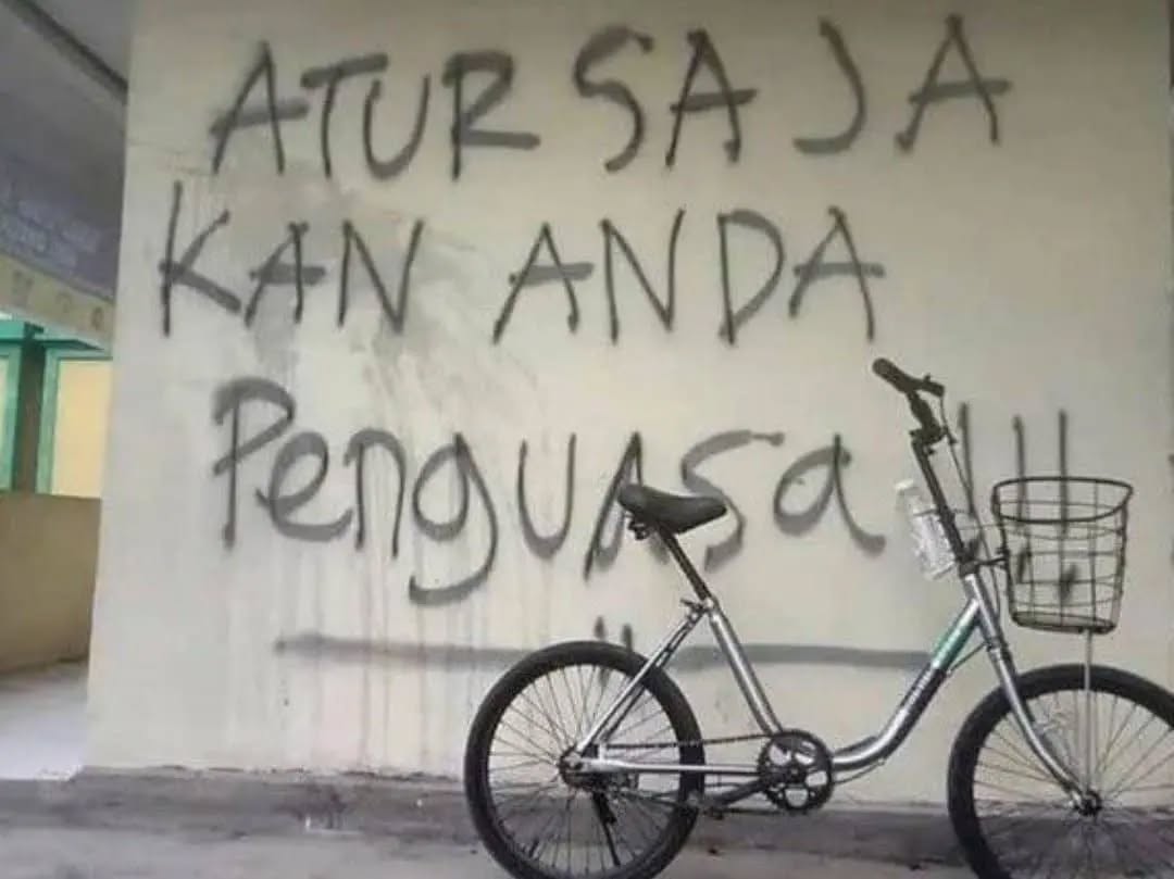 Saya tiba-tiba ingat tembok yang dicoret-coreti oleh entah siapa memakai huruf kapital: ATUR SAJA KAN ANDA Penguasa!!!