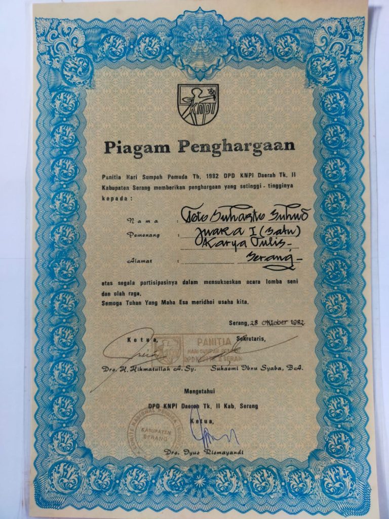 “Sebenarnya saya sudah dihubungi oleh Kantor Bahasa Provinsi Banten sekitar bulan April/Mei, tapi karena belum lengkap berkas akhirnya tidak jadi diusulkan. Ternyata pada bulan Juni dihubungi kembali untuk melengkapi berkas usulan pada periode ke-2. Alhamdulillah ketemu piagam penghargaan juara lomba karya tulis, juara lomba baca puisi, dan sebagainya pada tahun 1982 atau ketika itu saya masih SMA,” kenangnya.