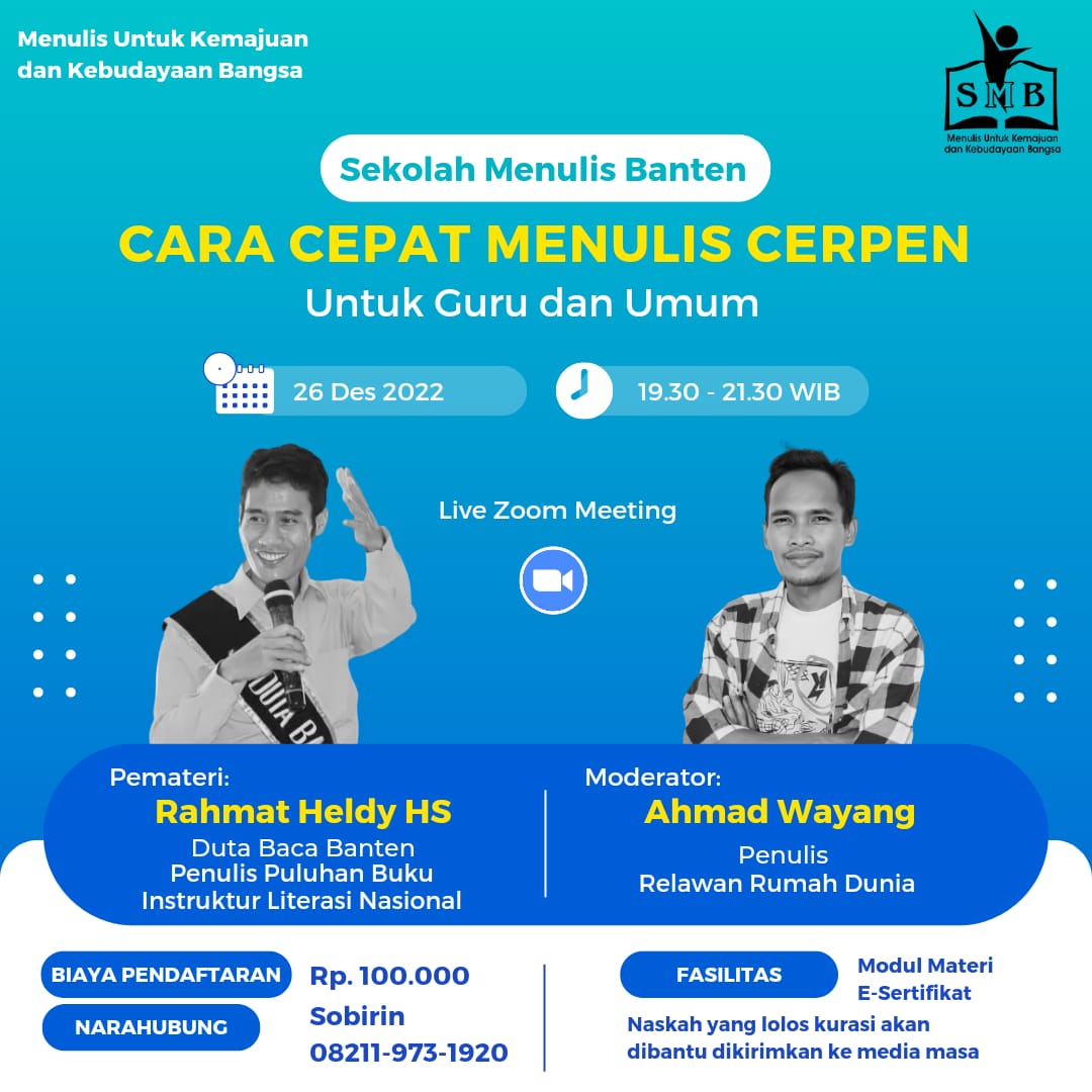 KURUNGBUKA.com, SERANG – Sekolah Menulis Banten (SMB) dalam waktu dekat akan menggelar pelatihan menulis cerita pendek (cerpen) bagi guru dan juga masyarakat umum. Tepatnya pada Senin, 26 Desember 2022, Pukul : 19.30 – 21.30 WIB yang berlangsung lewat Zoom Meeting.
